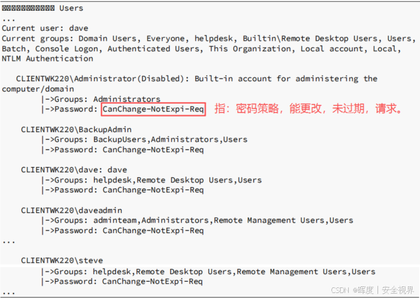 winPEAS 的输出清晰列出了:所有用户及其所属群组 。这种呈现方式使我们能够一目了然地掌握 现有用户及其成员身份,轻松识别出哪些用户隶属于某些组,例如: "远程桌面用户" 等关键组的用户。