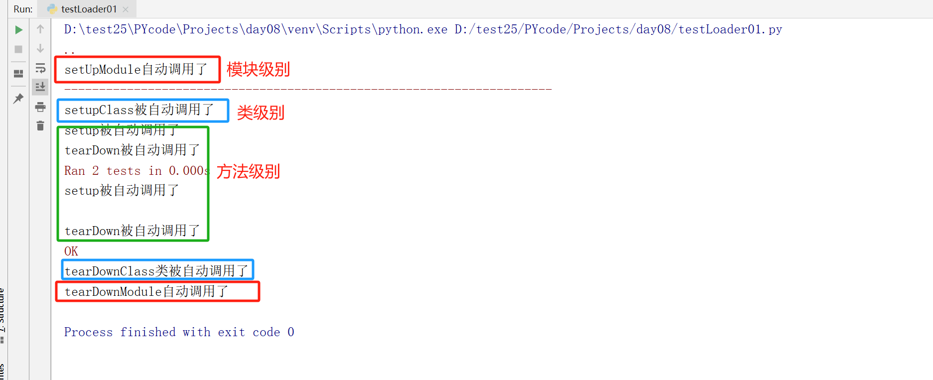 setUPClass, tearDownClass - 模块级别:不管一个模块(即py文件)中有多少类,模块执行前后自动调用函数;