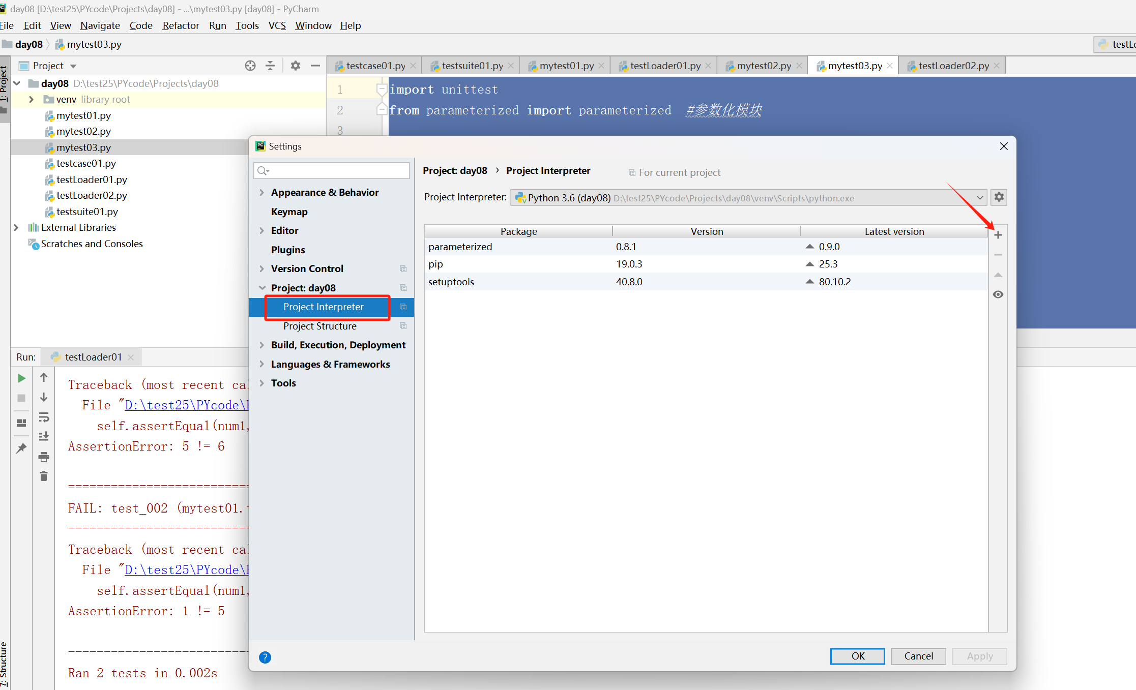 需要安装第三方包,setting中-Project Interpreter:右侧添加模块parameterized模块
