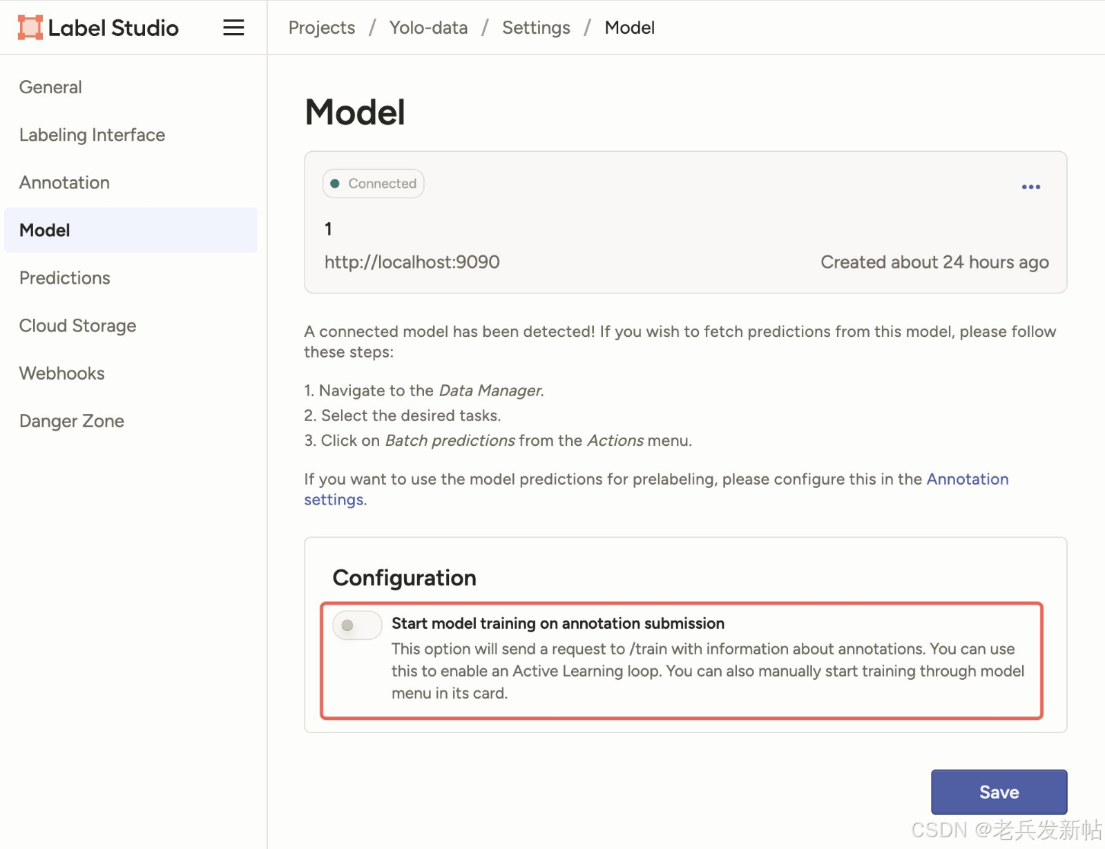 /train请求后,才会启动训练流程,用新数据更新模型。 - 模型更新 :新模型训练好后,会自动同步回Label Studio,为后续的数据进行更准确的预标注。这样就形成了一个"标注 → 训练 → 预标注 → 再标注"的增强循环。