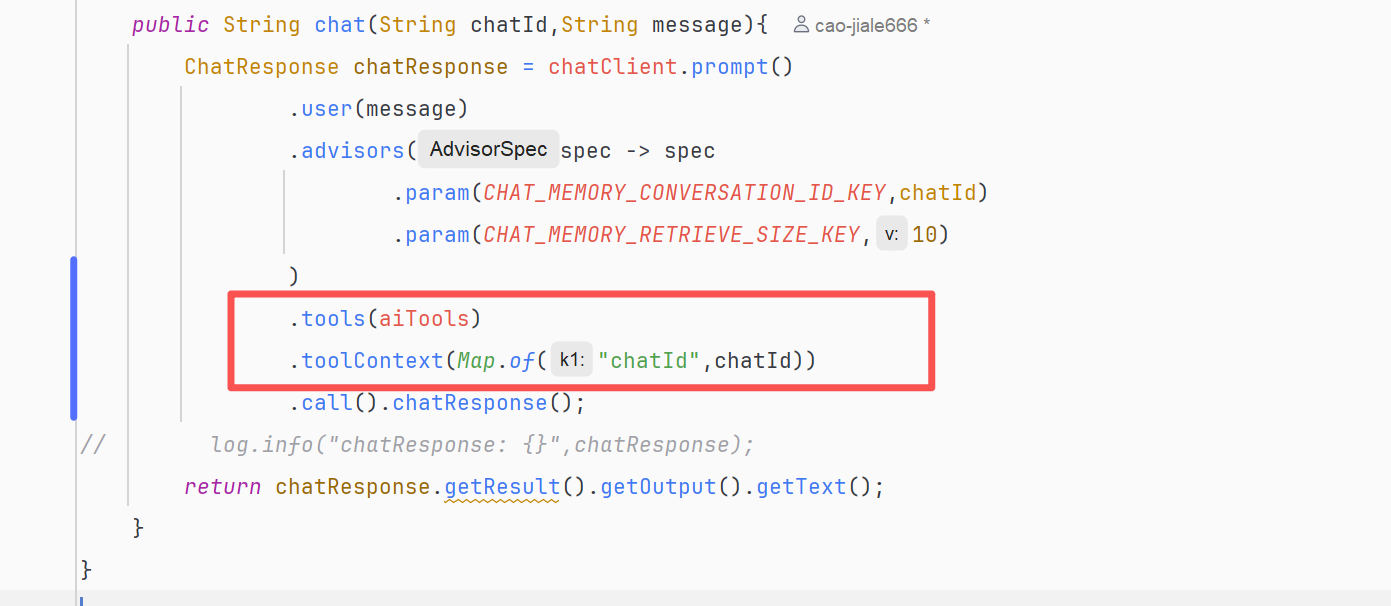 - 工具调用请求:Spring AI 自动处理与 AI 模型的通信并解析工具调用请求,并且支持多个工具链式调用。