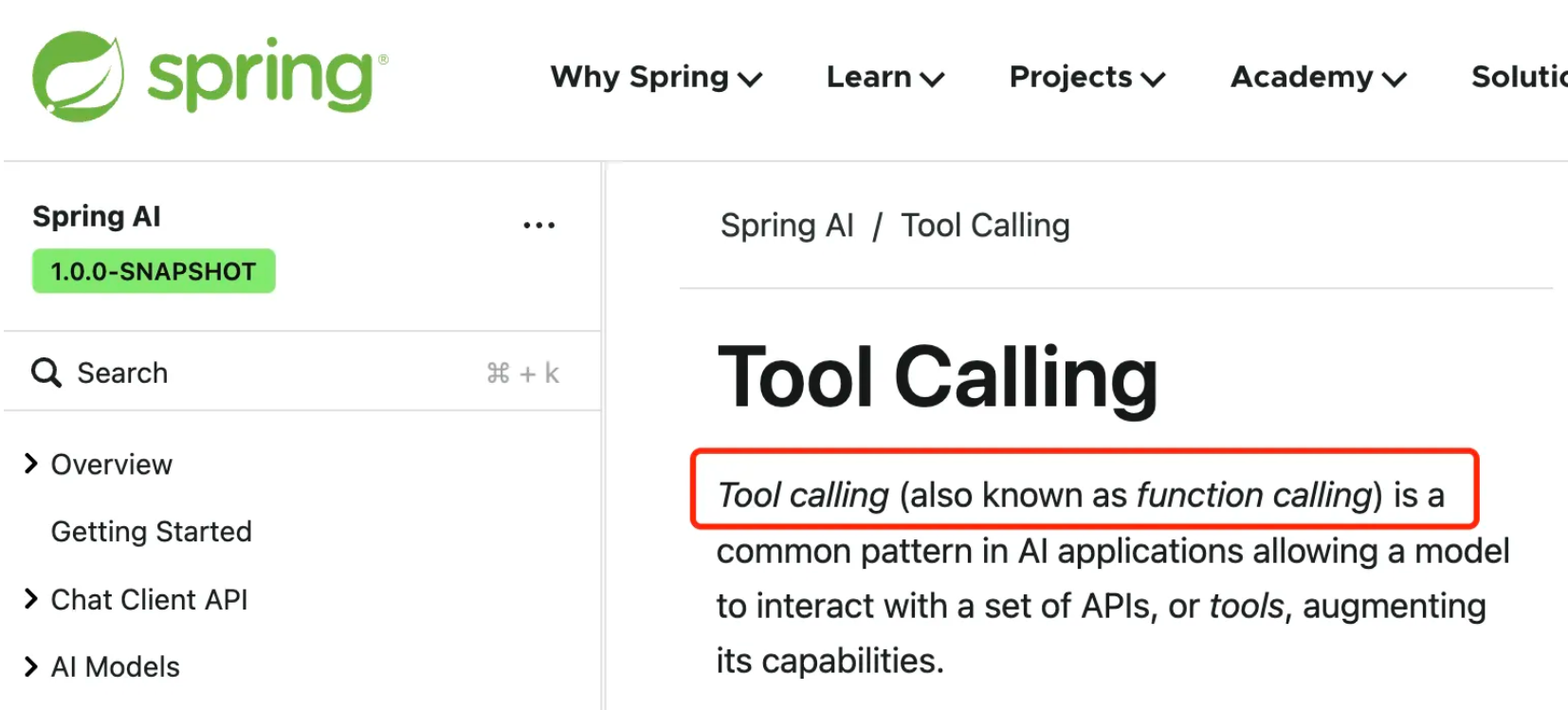 Spring AI 工具调用文档 的开头就说明了这一点:
