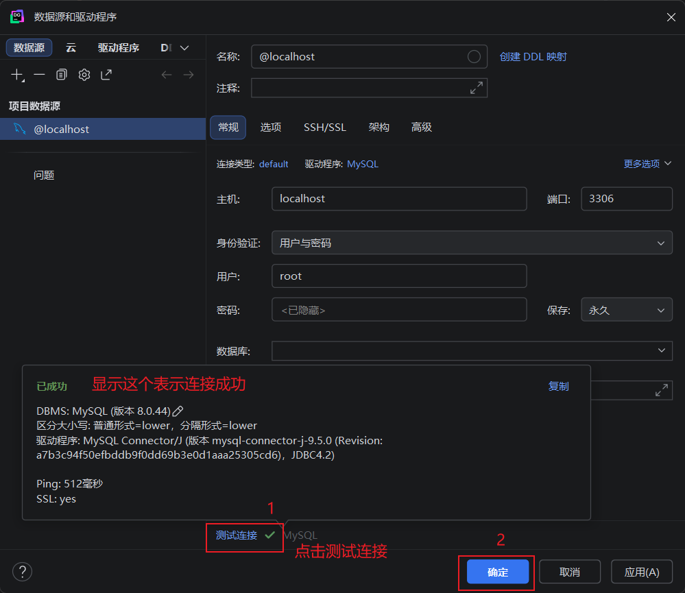 💡 提示:若连接失败,请确保 MySQL 服务正在运行,且用户允许从 localhost 登录。