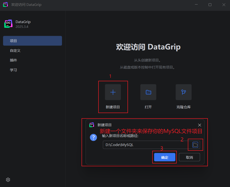 首次启动会提示创建新项目(可命名为 "MyDBProject")