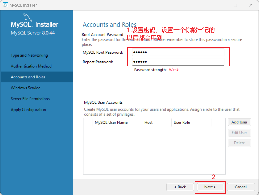⚠️ 重要提示 :输入MySQL中root用户的密码时,一定要记住该密码,后续连接数据库需要使用!