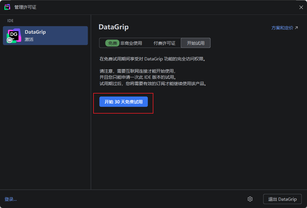 试用结束后仍可选择订阅或使用 JetBrains 其他免费数据库工具:试用期结束后,您可以选择订阅以继续使用 DataGrip 的全部功能,或考虑 JetBrains 提供的其他免费数据库工具进行日常开发。