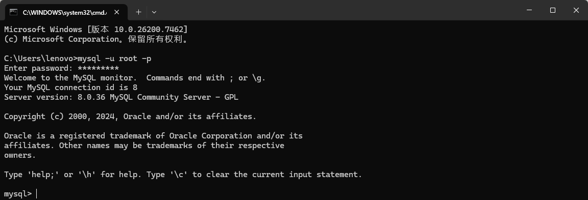 mysql [-h 127.0.0.1] [-P 3306] -u root -p