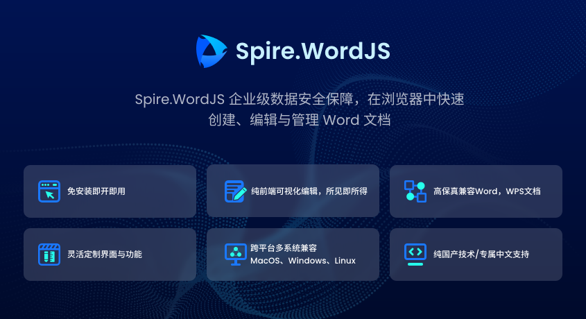 Spire.WordJS 基于 HTML5 标准,支持跨平台开发和集成,支持所有主流浏览器,无需安装任何插件或第三方组件,以原生的方式嵌入各类应用,可以与各类前端技术框架Vue、React、Angular 等相结合。 Spire.WordJS以纯前端、跨平台的能力,让您的应用系统轻松获得与Word,WPS文档一致的交互体验。