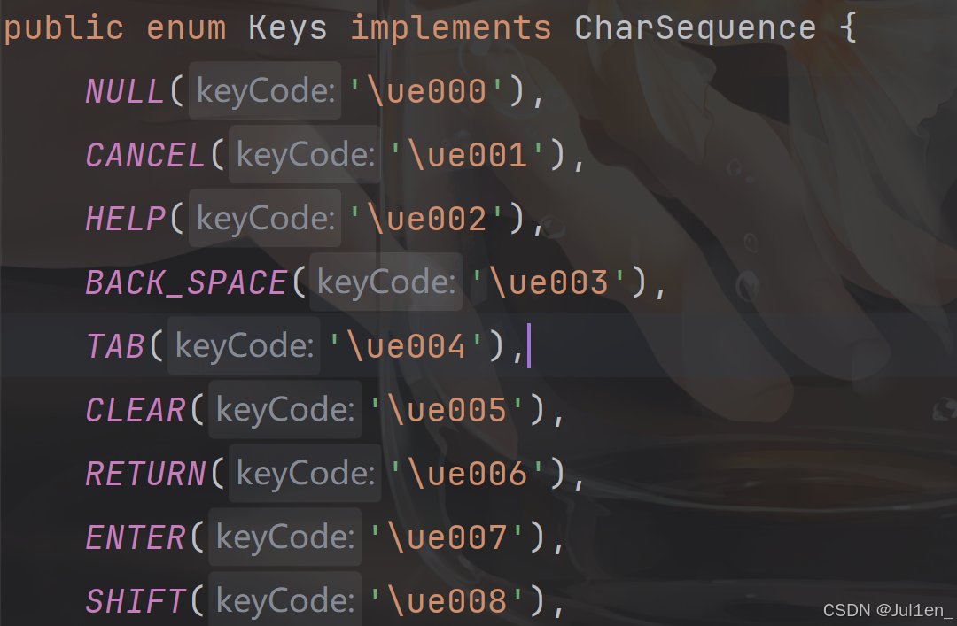 通常配合 Keys 枚举类使用,适合处理快捷键组合。Keys类枚举了许多键盘的按键,列举几个常用的