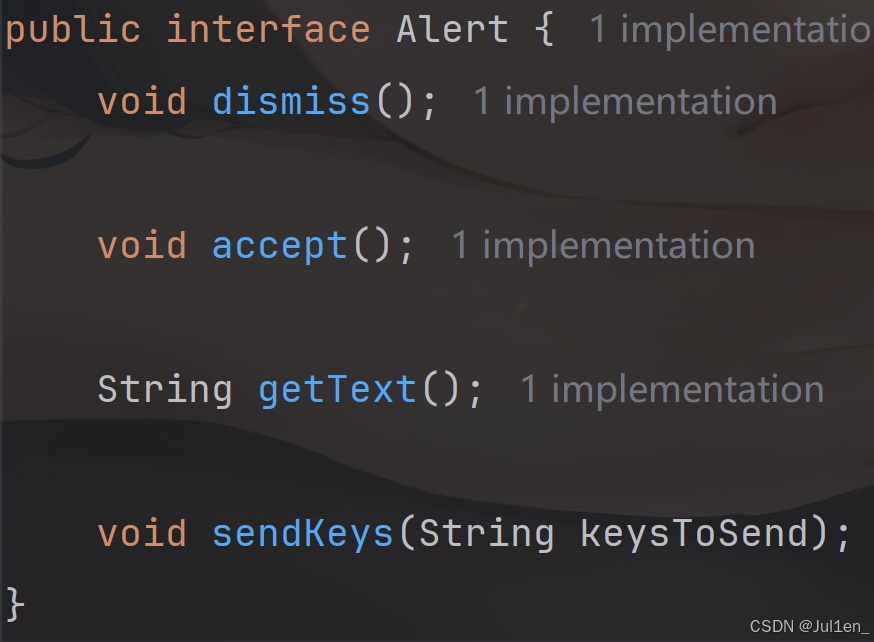 driver.switchTo().alert()切换焦点,三种弹窗都能切换。弹窗一般有这三种弹窗类型 描述 操作方法 警告弹窗 只有"确定"按钮 alert.accept()确认弹窗 有"确定"和"取消" accept() / dismiss()提示弹窗 可以输入文本 sendKeys("文本")后accept() / dismiss()