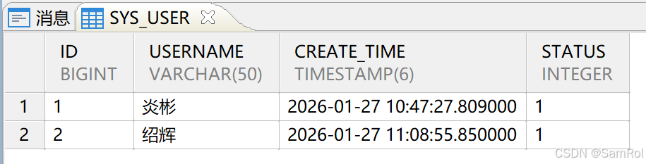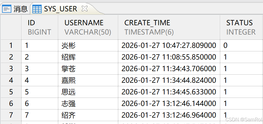 INSERT INTO SYS_USER (USERNAME, STATUS) VALUES ('zhangsan', 1), ('lisi', 0), ('wangwu', 1);