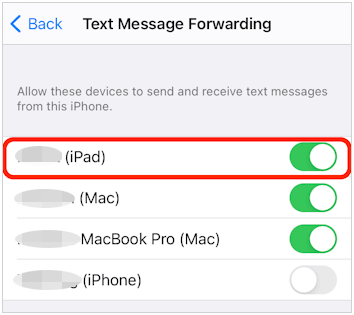 步骤 3: 然后打开 iPhone 上的**"设置"** ,依次选择"应用 ">"信息 ">"短信转发",并为你的 Mac 或其他 Apple 设备开启该开关。最后,发送到你手机号码的短信就会出现在 Mac 上的"信息"应用中。