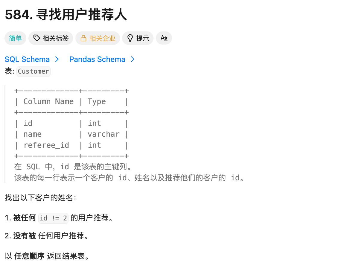 - referee_id IS NULL:没有被任何用户推荐(推荐人为空)