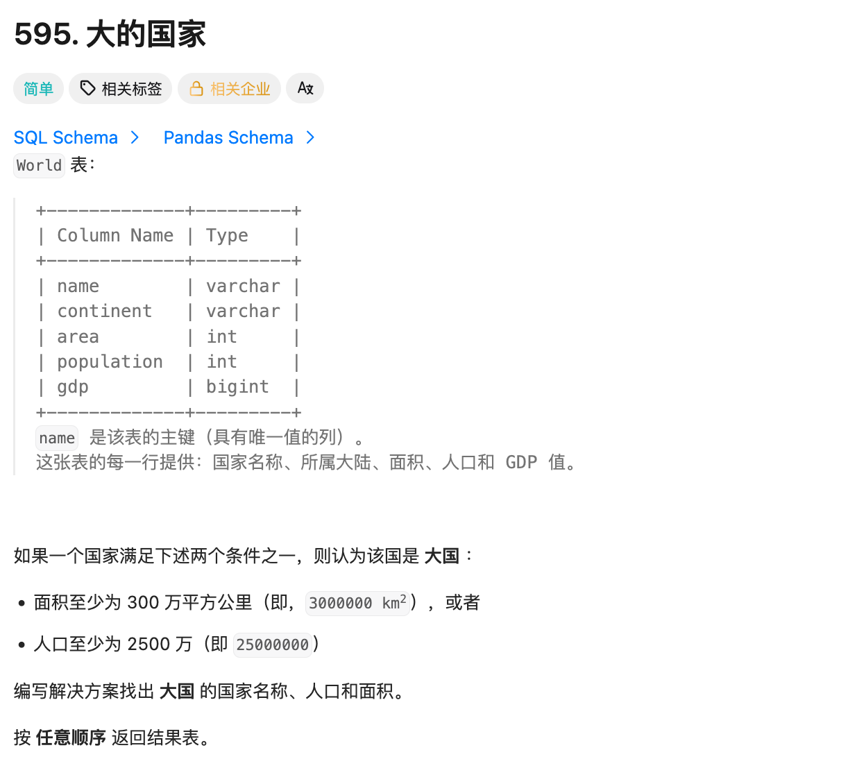 正确SQL:SELECT name, population, area