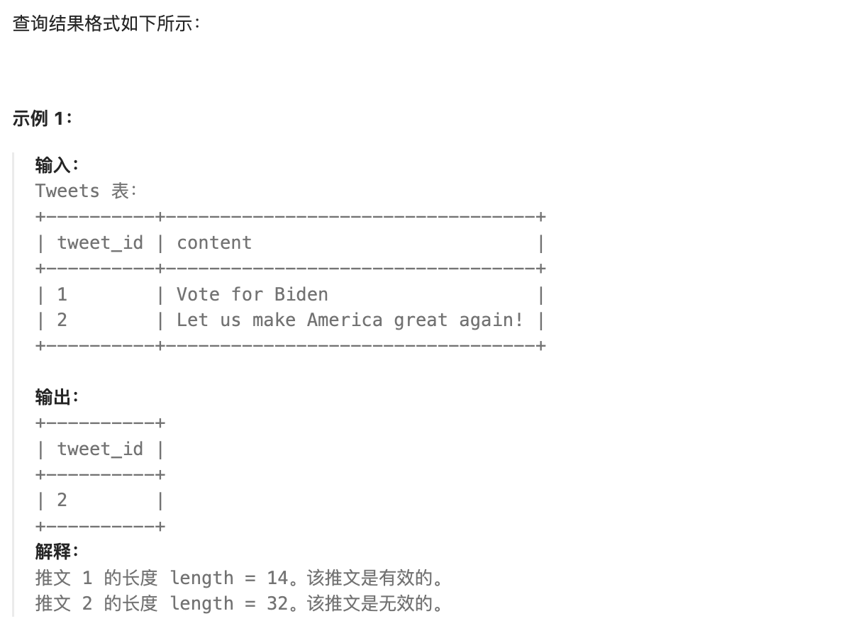 - tweet_id=5 有15个字符,等于15,不是严格大于,所以是有效的,不会被查询出来