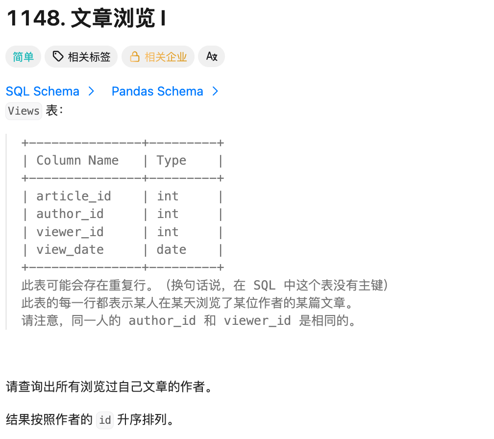 - 题目说明:同一人的 author_id 和 viewer_id 相同