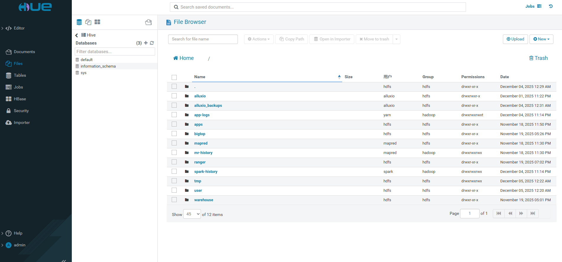 配置完成并重启服务后,重新访问 Hue 的 HDFS 页面: