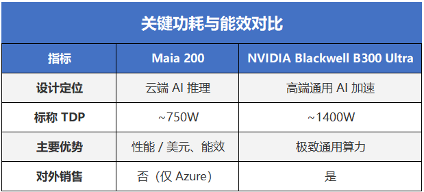 这个数字之所以值得关注,是因为 Maia 200 的标称热设计功耗(TDP)相比 Maia 100 提高了约 50%。换句话说,这并不是通过"压功耗"换来的账面效率,而是一次在更高功耗区间内实现的真实性能跃迁。