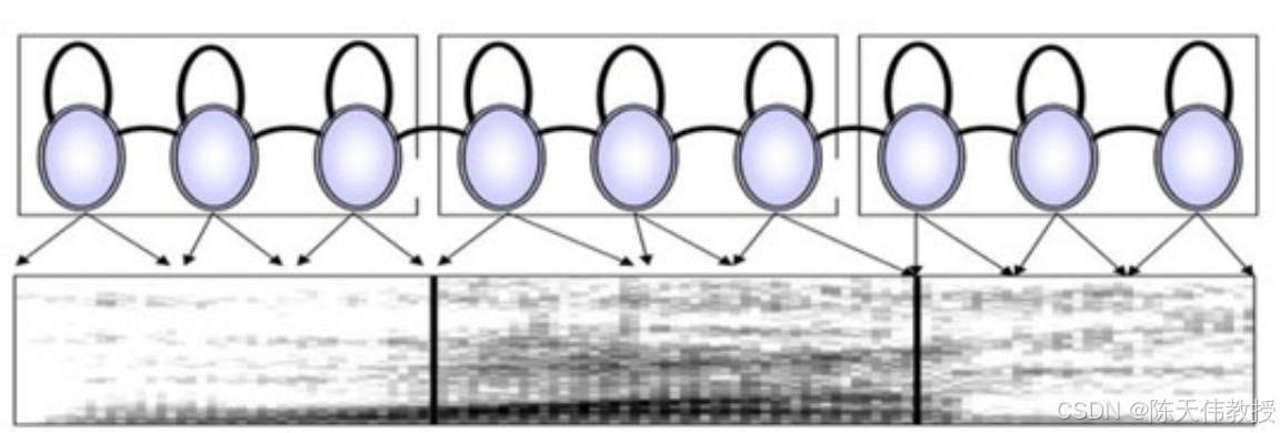 隐马尔可夫模型(HMM)描述语音的生成过程。每个圆圈代表一个状态,每三个状态代表一个发音单元(音素)。