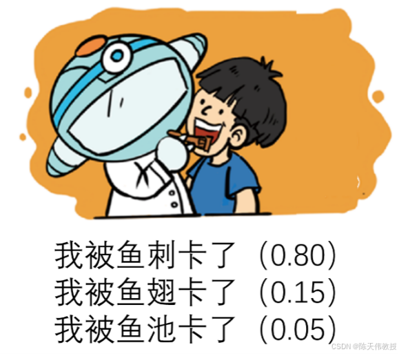 语言模型在语音识别中,除了声学信息,语言信息同样重要。语言信息可以通过语言模型引入,用来选择更合理的句子。图展示了一个例子。在这个例子中,待识别的句子在发音上比较模糊,声学模型难以区分"鱼刺"、"鱼翅"和"鱼池"这三个词。此时,语言模型可以发挥作用。根据语言背景知识,"我被鱼刺卡了"更符合常理,语言模型赋予其更高的概率(0.80)。因此,基本上可以断定句子里说的是"鱼刺"。