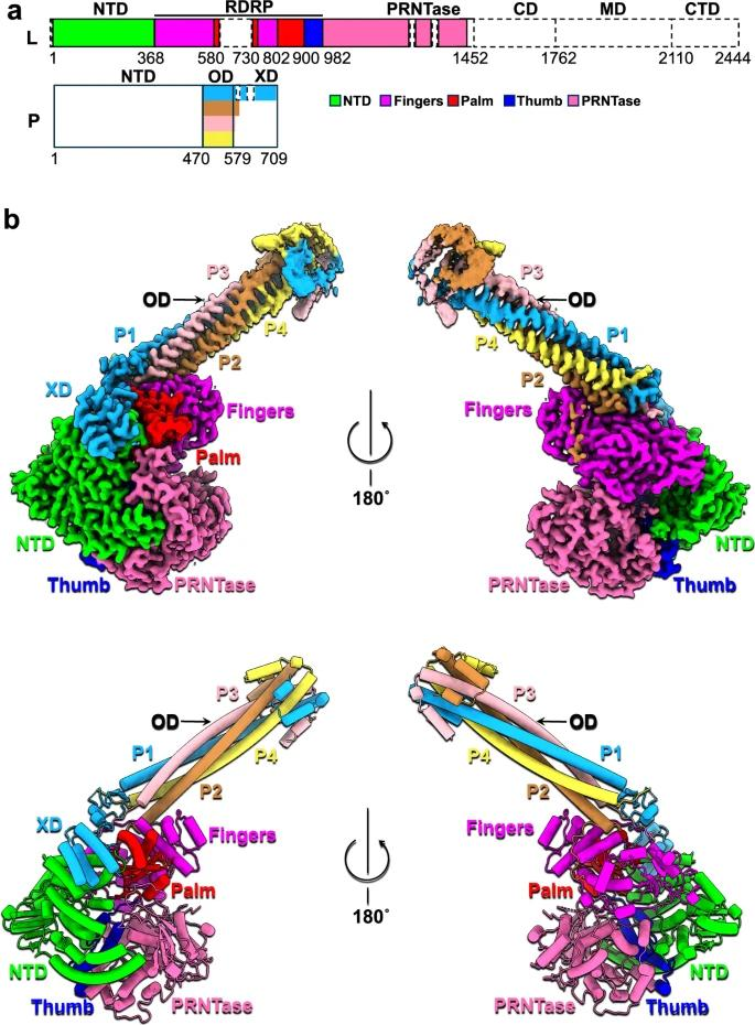L蛋白是病毒最大的结构蛋白,分子量约240 kDa,作为RNA依赖的RNA聚合酶,是病毒基因组转录与复制的核心执行者。其具有多个保守的功能结构域,包括RNA聚合酶活性中心、加帽酶、甲基转移酶及多聚腺苷酸化活性。L蛋白必须与P蛋白形成复合物才能发挥功能,该复合物以核衣壳为模板,合成病毒mRNA及基因组RNA。重组L-P蛋白复合物是体外研究病毒复制机制的重要平台。