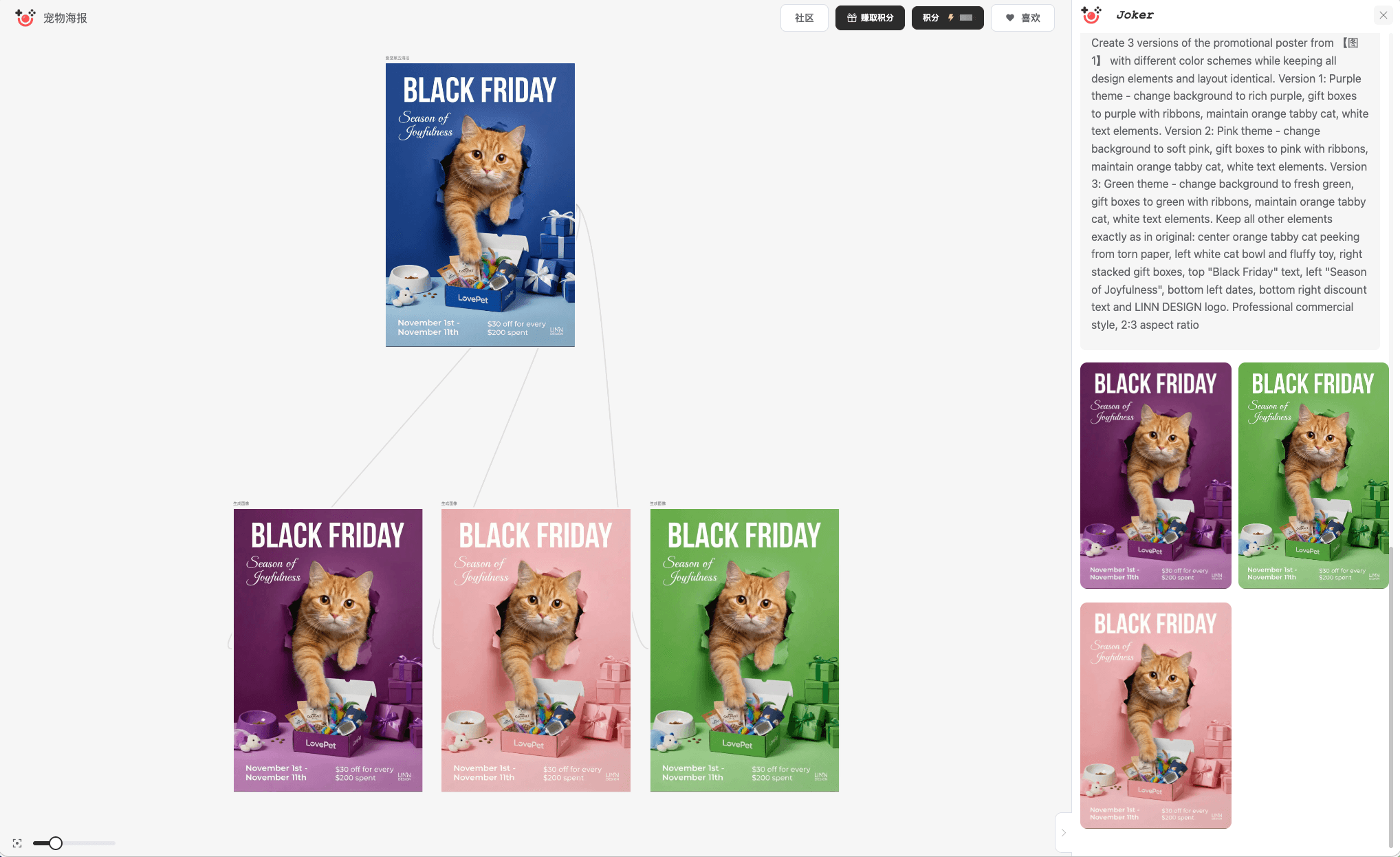 Joker AIx智绘工坊把"无限画布"当成核心亮点来做,从一开始构思创意、批量生成素材,到实时调整细节、最终导出成品,整个过程都能在这一张画布上完成。再也不用在多个软件间切换来切换去,省去了大量冗余操作,创作节奏能一直保持连贯,体验感直接拉满。