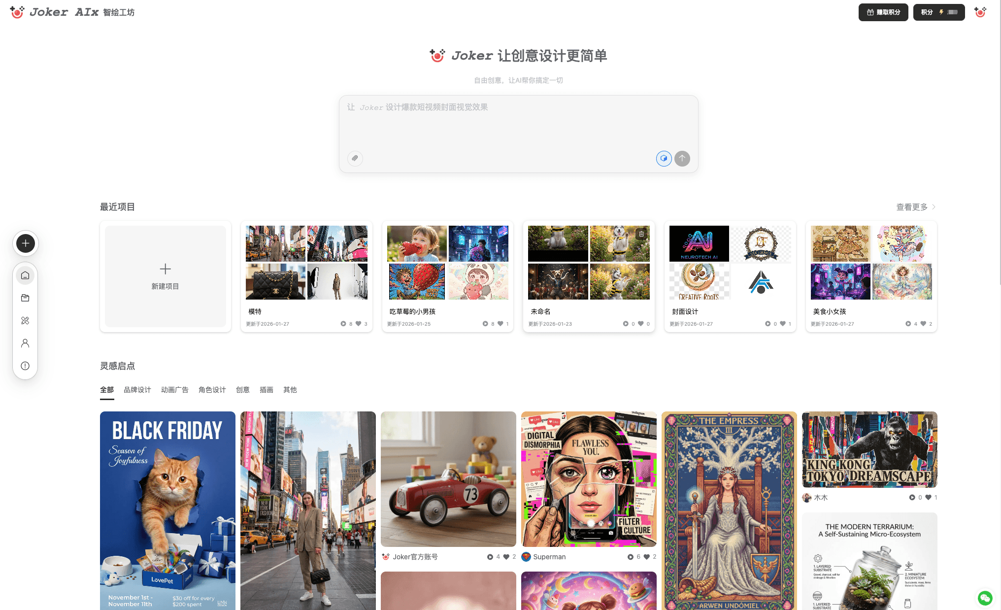 如今AI设计工具早就不是可有可无的辅助项,成了创意行业的刚需生产力。但用过的人都懂,市面上大多产品毛病不少:要么只能用单一模型,创意被框死;要么做图、剪视频、配文案得换好几个工具,来回导出导入太折腾;流程碎成一地,效率根本上不去。Joker精准踩中这些痛点,直接整合了几十种国内外主流AI模型,打造成真正能一站式搞定所有创作的All In One平台,把AI时代的创作流程彻底焕新。