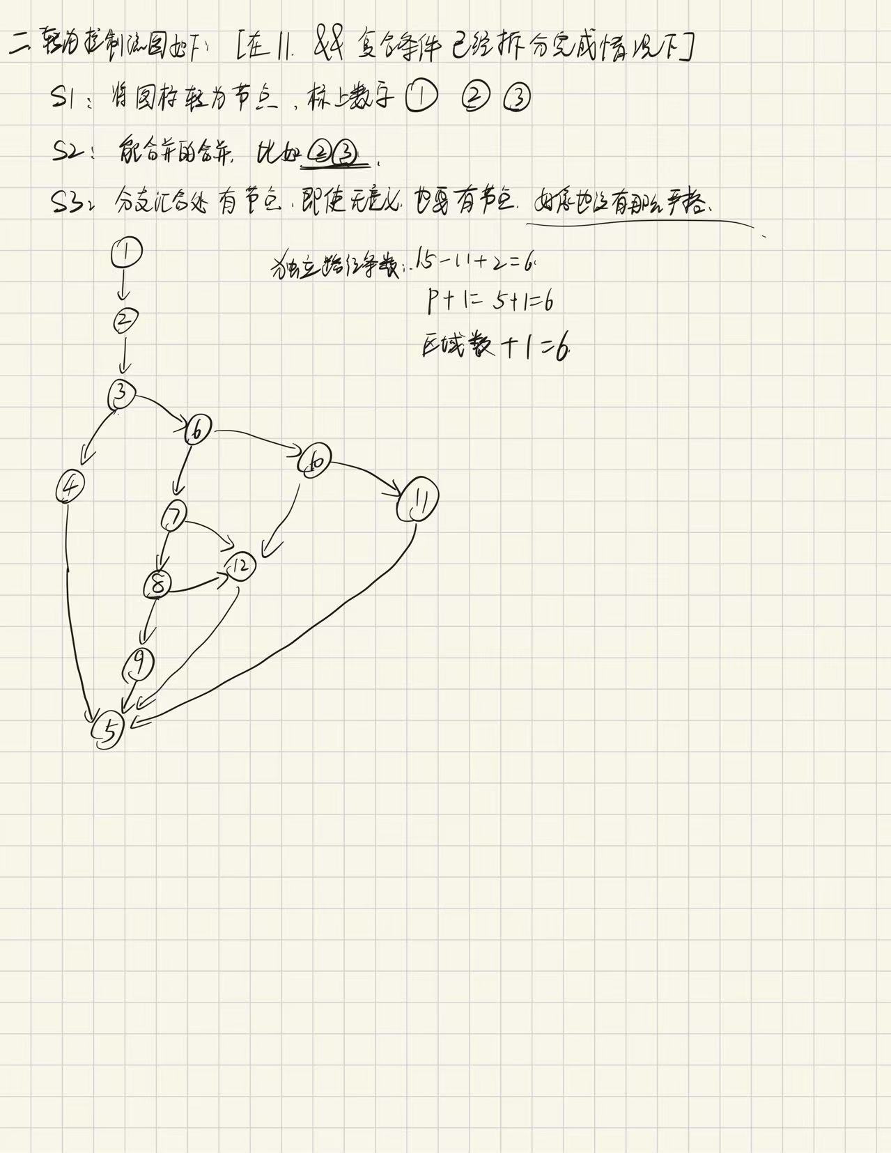 将流程图中每个步骤用数字+节点代替,画出控制流图,一般分支汇合处会有一个无意义的会和节点;主分支上也可以将两个节点合并,比如:开始①------输入abd②------int i=1③,则流图中②和③可以合并。
