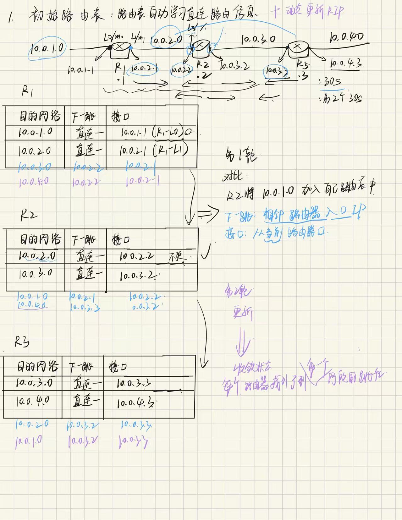 (1)RIP路由表初始化时刻:路由表中只有直连网络的路由信息,下一跳IP为离目的网络最近的路由器IP,一般为该路由器的出入口IP,跳数为1.
