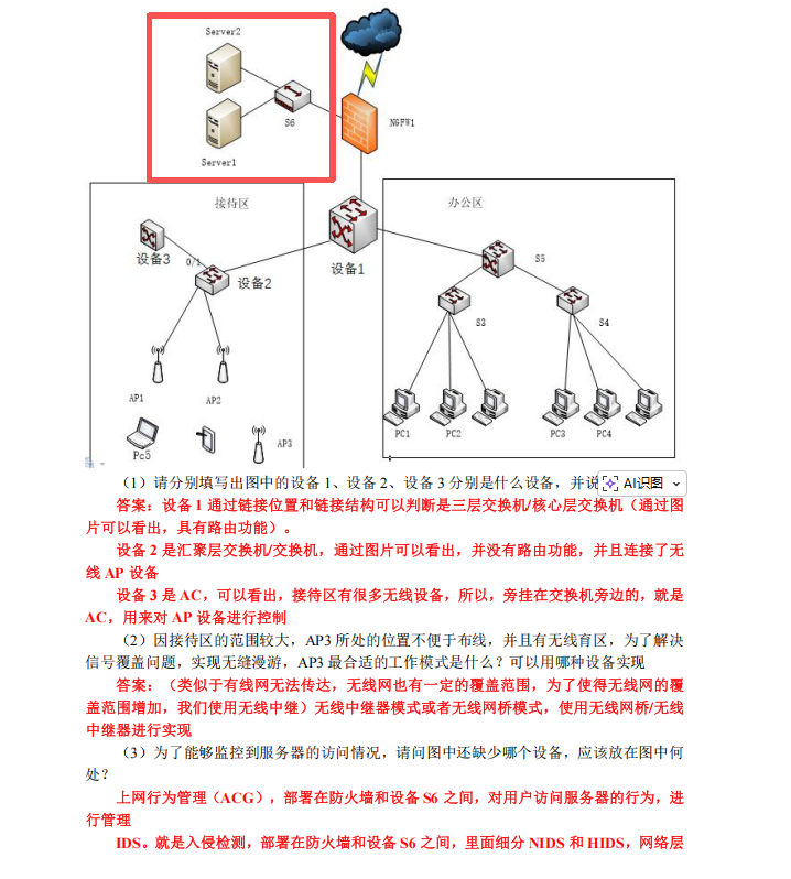 核心交换机(三层交换机):具备路由功能,在图中如果没有找到路由器,但图标又很像交换机时,则它就是核心层交换机!!可以进行路由选择,数据的高速传输。如下设备1 是核心层交换机,而非路由器。