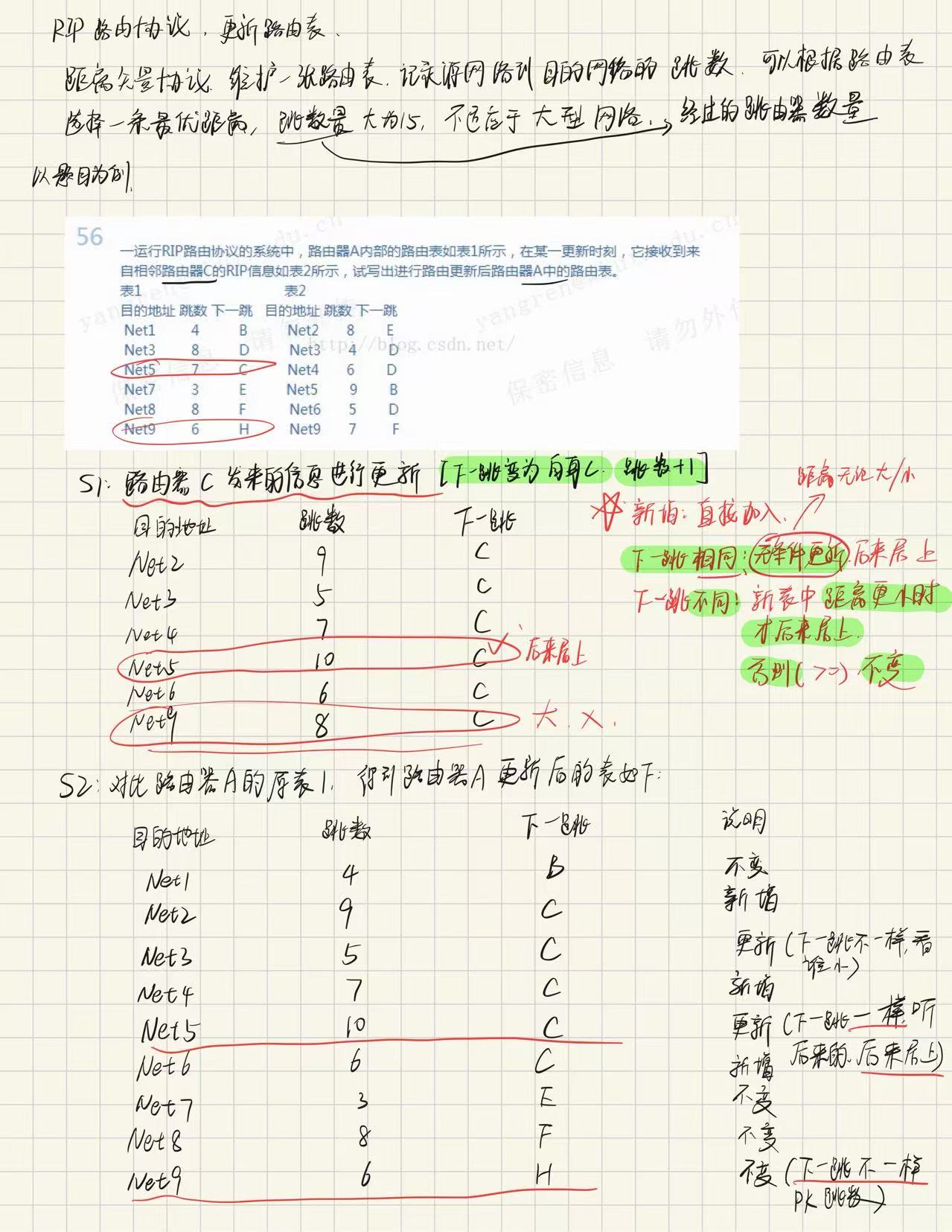 原则:(1)A收到C来的路由表,先将收到的表更新:跳数+1,下一跳全部设为C