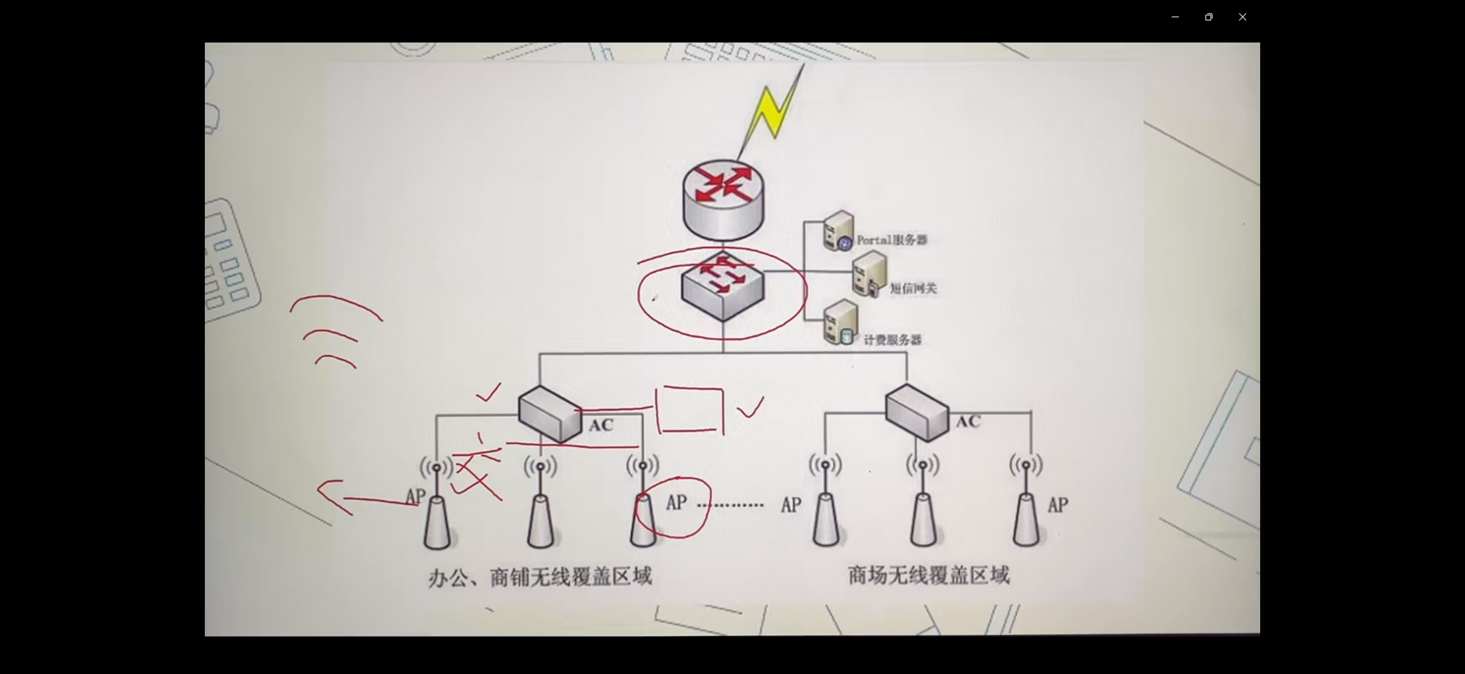 无线AC:一般旁挂在核心交换机(汇聚)旁,集中管理无线AP设备,负责流量控制和实现负载均衡