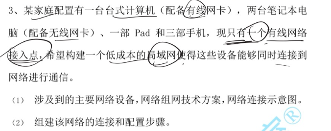 场景 :一个小型办公室 ,有5台台式机(需有线连接)、3台笔记本(无线)、2台网络打印机。运营商只提供了一个有线网络接口 。老板要求网络稳定,且笔记本能在办公室任何位置连接。