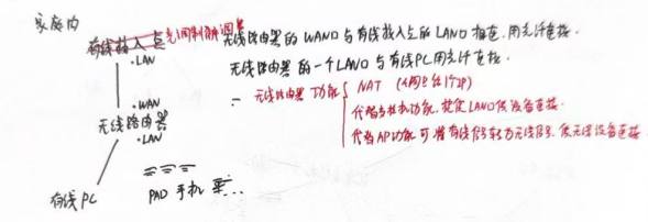 无线路由器:家庭内部使用无线路由器设备,具有路由功能,可以将NAT地址转换,多个设备可以共享一个公网IP;具备交换机功能,可以提供LAN口供有线设备连接;具备无线AP功能,将有线信号转为无线信号,用于无线设备,如手机、PAD联网使用。