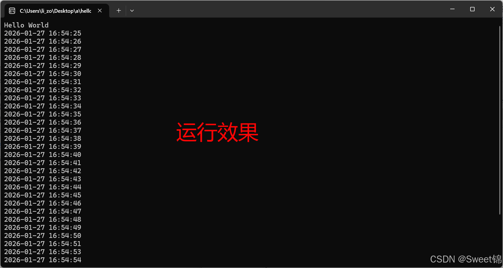 功能描述:输出 Hello World,并每隔1秒,在控制台打印一次系统时间。
