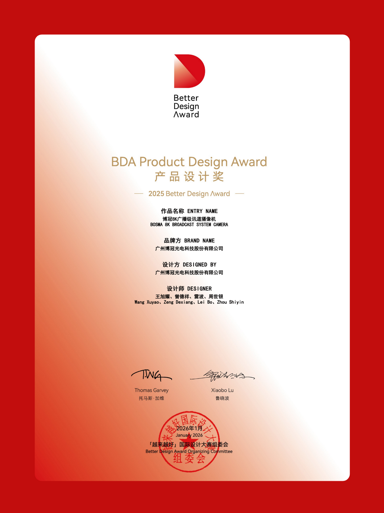 「越来越好」国际设计大赛(英文名称为Better Design Award,简称BDA),是在原"省长杯"工业设计大赛基础上,由中央广播电视总台、广东省人民政府、广州市人民政府、深圳市人民政府指导,对标国际知名设计赛事打造的国际化综合设计领域赛事。