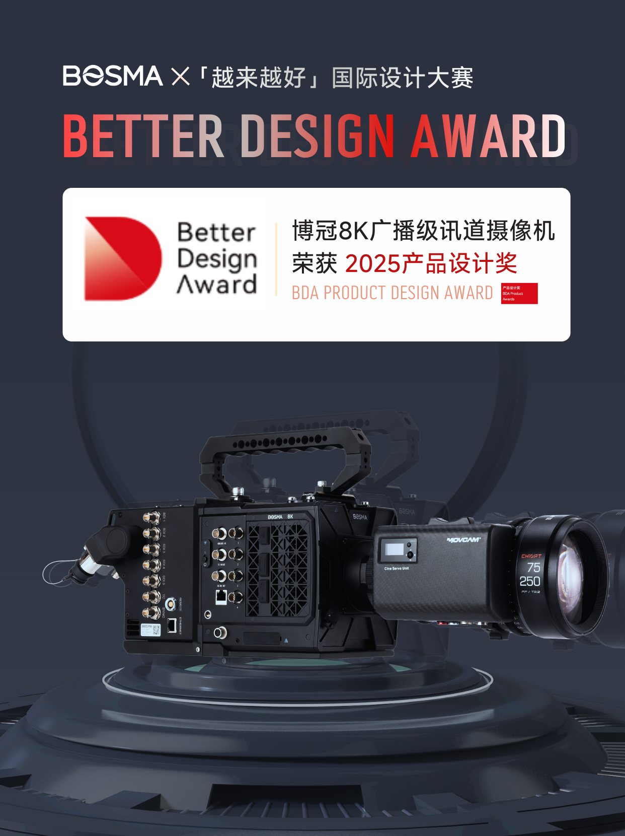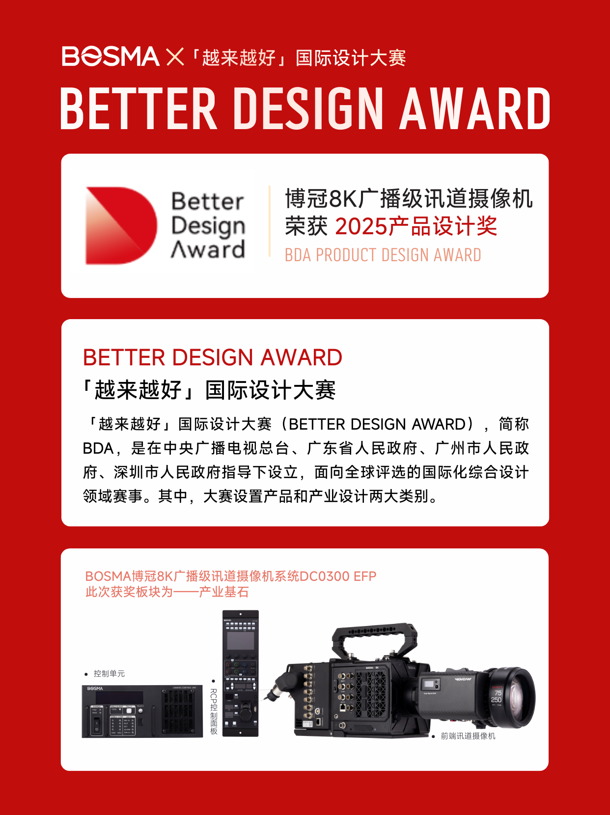 经过与全球15691件设计作品的激烈竞争,BOSMA博冠于2025年发布的全新一代国产8K广播级讯道摄像机DC0300 EFP脱颖而出,荣获「越来越好」国际设计大赛------产品设计奖。其中,产品设计包含1个主体赛和1个专项赛,主体赛分为产业基石、美好生活、未来设计三大组别,DC0300 EFP所获奖项恰为其中的"产业基石",其背后蕴含的深刻意义不言而喻。
