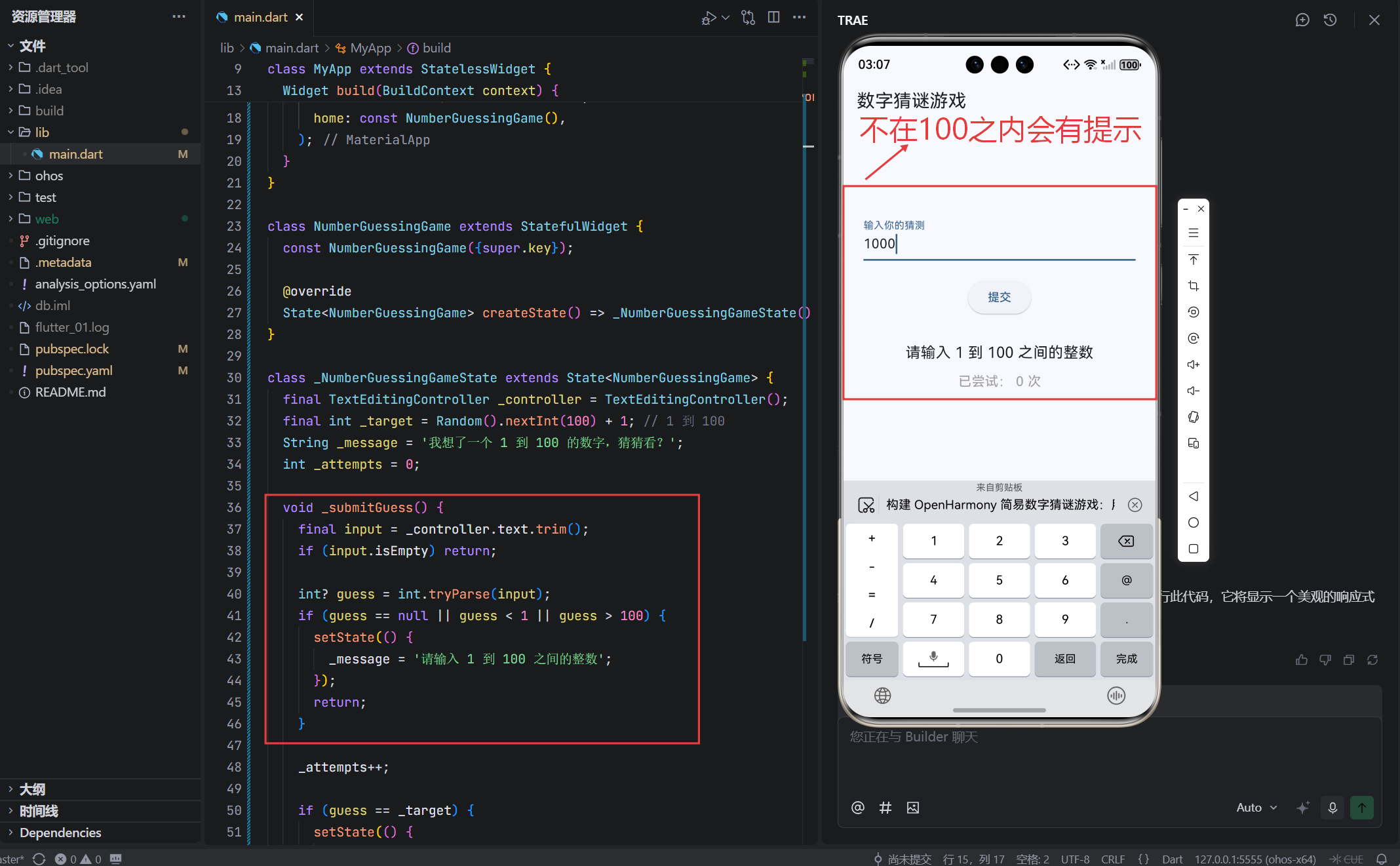 TextInputType.number弹出数字键盘;hintText: '1 - 100'提供范围提示;onSubmitted支持回车提交,提升效率;