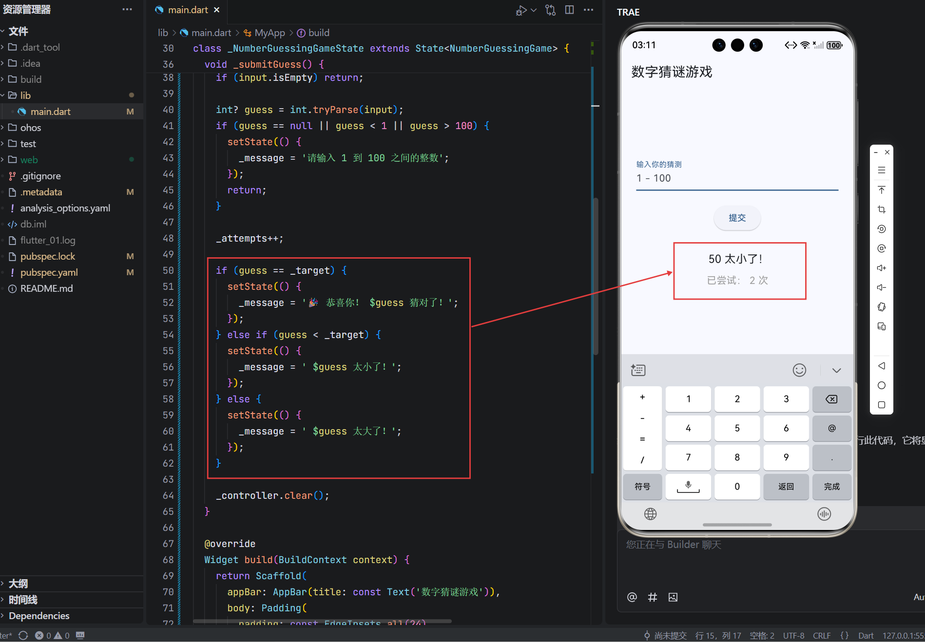 _target:目标数字(在initState前通过字段初始化完成);_message:当前提示信息;_attempts:尝试次数;_controller.text:用户当前输入。