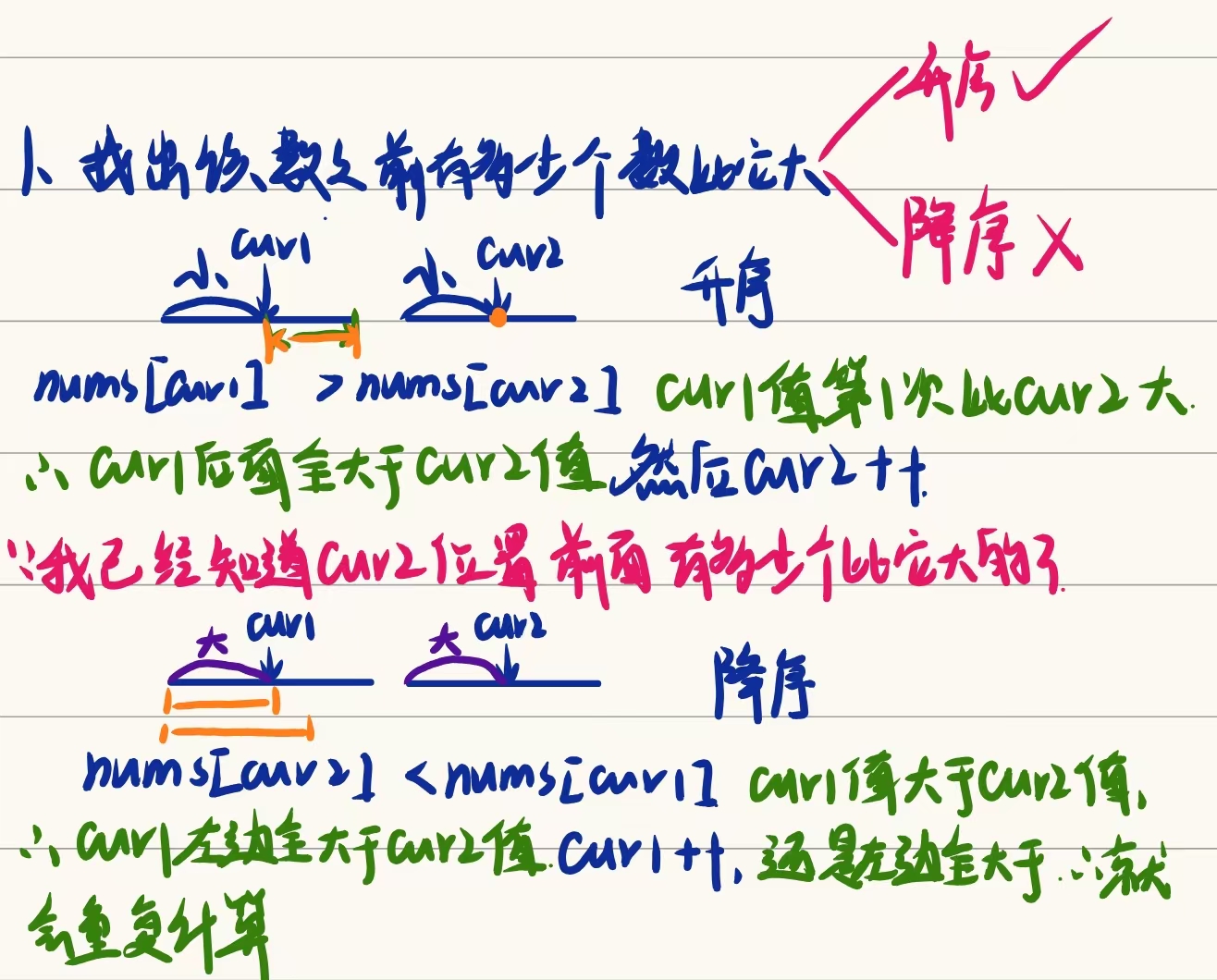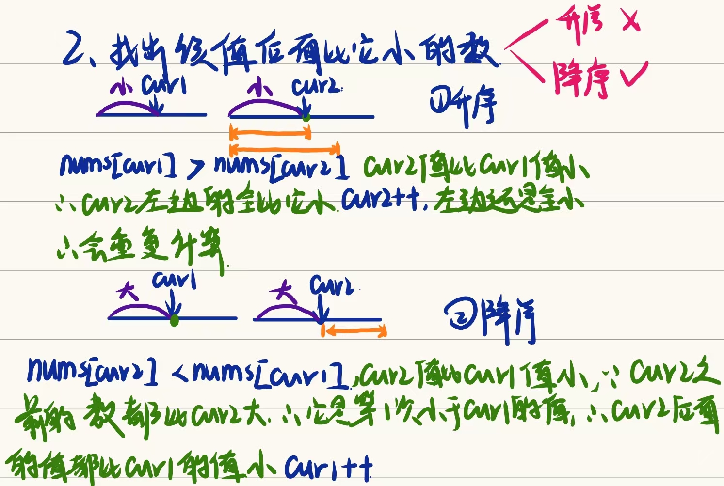 nums[cur1] <= nums[cur2] :因为要找的是cur2的值小,这个就是不符合条件的,所以我们没有在后面没有找到比这个值小的元素,所以cur2++