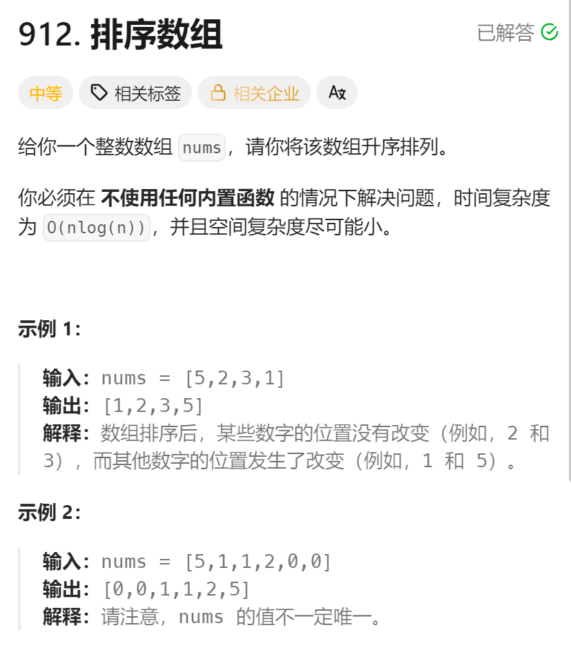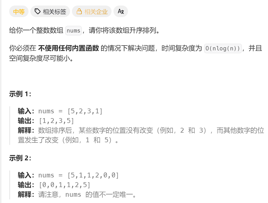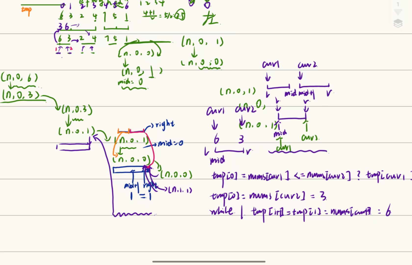 tmp[i++] = nums[cur2++];//完成排序和cur指针移动---因为我们排升序,所以先把小的放到数组