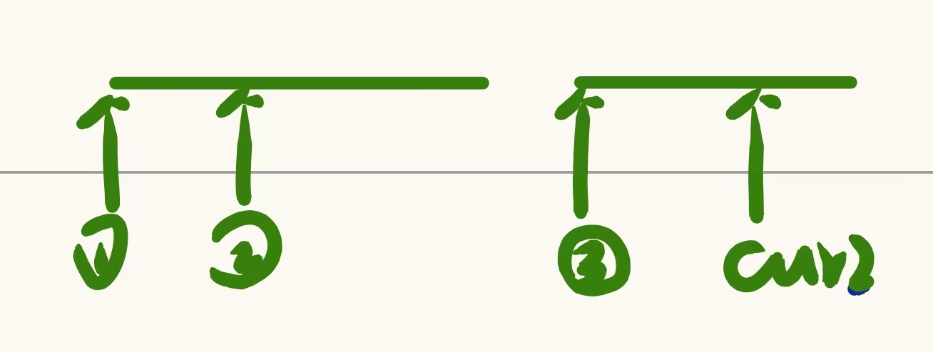 因为,1的值比2大,右边比他小的都要移动到cur2,现在cur1右移了,移动到2了,那么比他小的数肯定不可能是在cur2的左边,所以不用回退,直接让cur2向右移动,知道出现了比cur1值小的位置,就用公式统计。知道cur1或者cur2移动到最后为止。