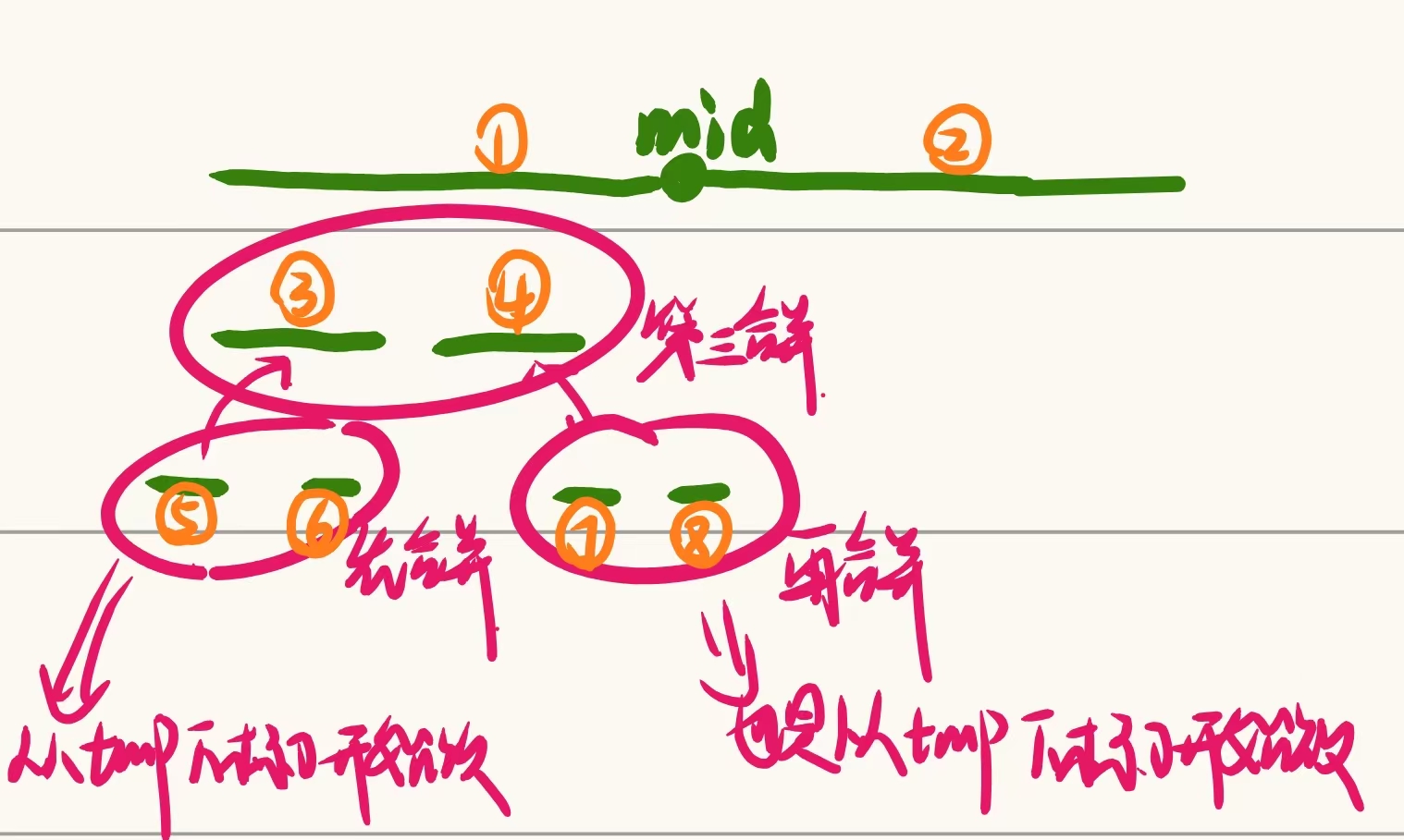 肯定不会出现,因为,要进行合并的两个数组肯定是先进行过排序的【因为在递归中,先进行判断看不是符合逆序对的要求,再进行将小的先放到tmp数组,返回过来要进行合并的两个区间的数都是已经经过排序的!!!这点很重要。 每次要进行数组合并之前,都会拿到nums数组,只是每次要合并的区间不一样,区间是不断扩大的,父节点要进行合并操作的数组范围肯定是包含了两个孩子的区域的,只是将两个区域的顺序重新进行排序(升序),其实在排序过程中,就会完成左右区间各取一个时的逆序对的取值。
