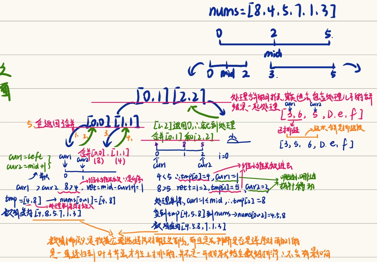 所以,最重要的就是我们要找到当前元素**(nums[cur1])**的原始下标,合并的时候其实是在左边拿一个右边拿(说到底其实都是左边拿一个右边拿一个,因为会分到只有一个元素,再从下往上合并),所有,当左拿一右拿一的时候,元素的位置可能就不是元素的时的位置了,因为进行排序过了。