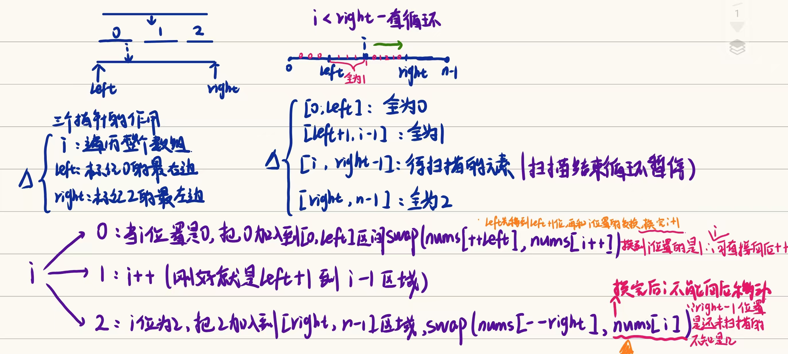 用指针i、left、right 三个指针,用i遍历整个数组,left指针标记小于key的区域最右边,right标记大于key区域的最左边