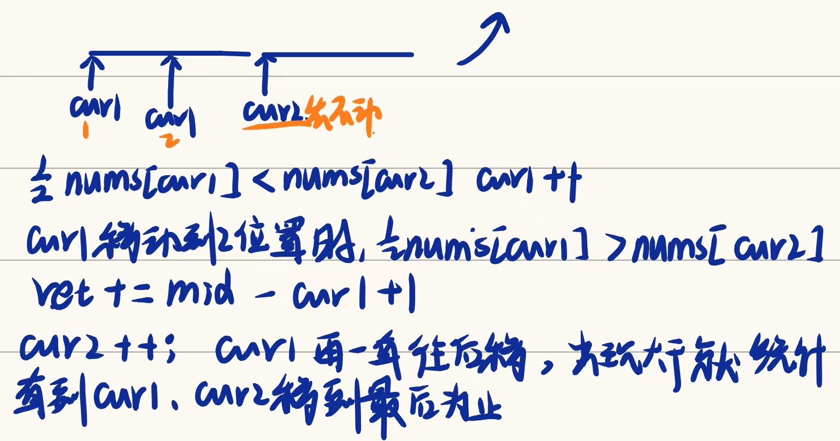 【解释代码】为什么是index[cur1]? 因为这个时候已经找到nums[cur1] > nums[cur2]了,那么我们就知道,此时,cur1值比cur2后面的都大,所以计算的个数就是right - cur2 + 1,而且我们计算的是比cur1值小的所有数的个数,肯定就是index[cur1]喽