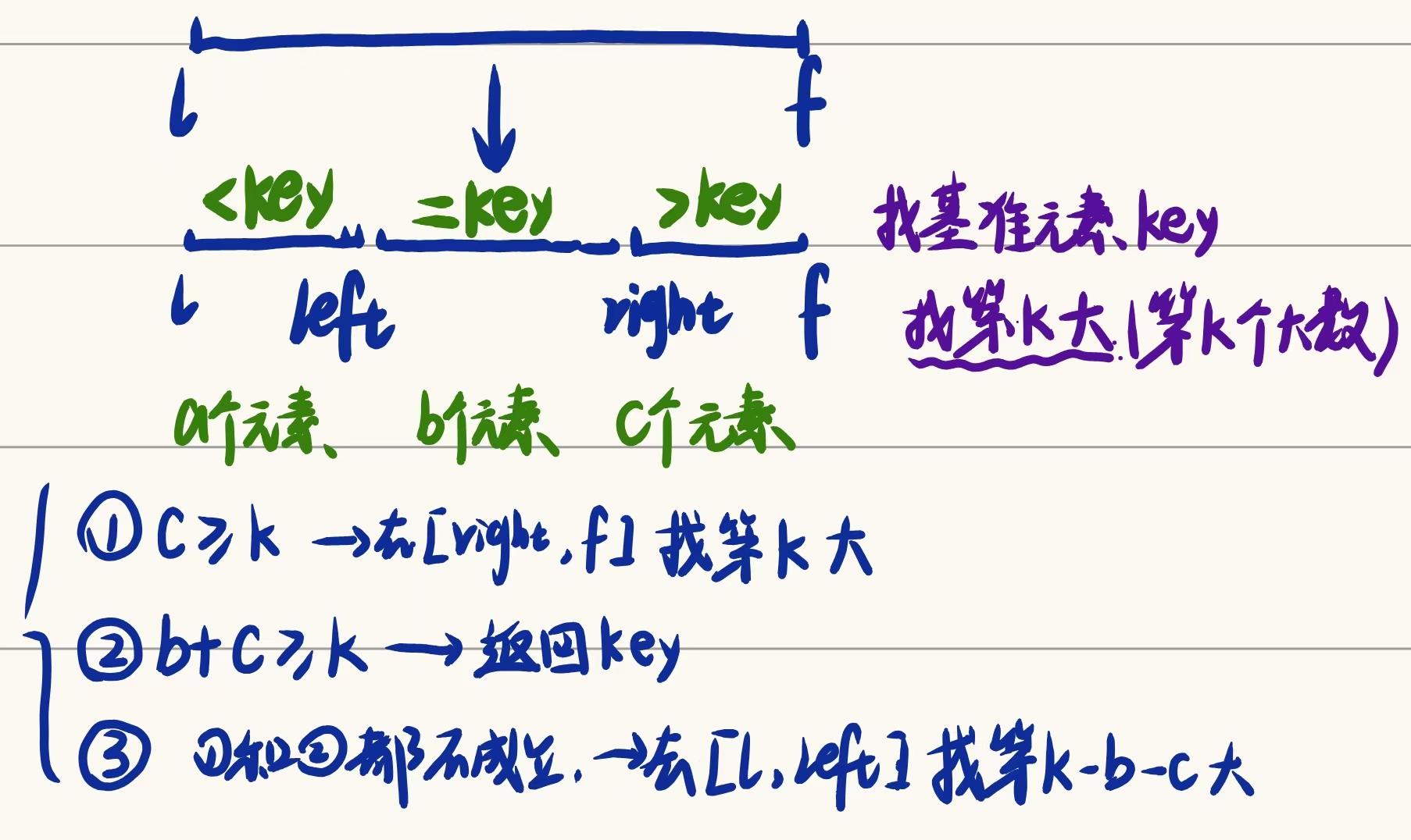 当分类讨论第三种情况的时候,我们直接就去大于key的区间去找k-a-b个较小的元素就好了,这个时候其实a和b区间还是没有排序的,我们其实就不用排序,直接输出就好了。【我们选择基准元素的时候是等概率划分的】