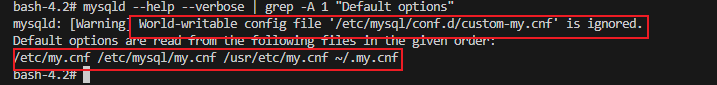 可以看到警告:全局可写配置文件"/etc/mysql/conf.d/custom-my.cnf"被忽略