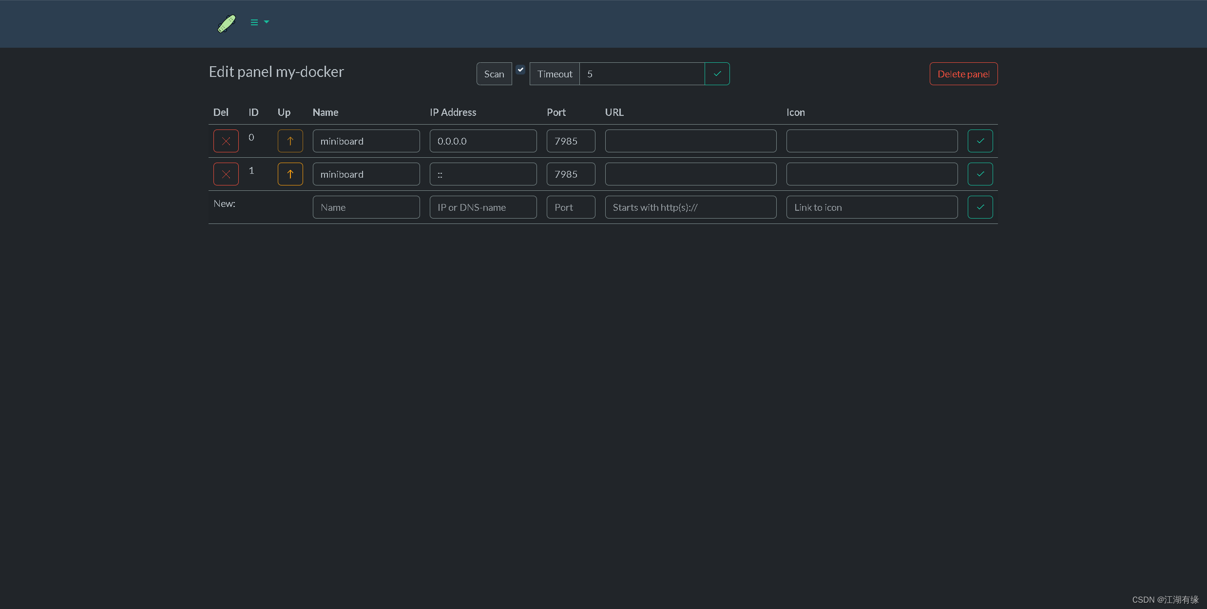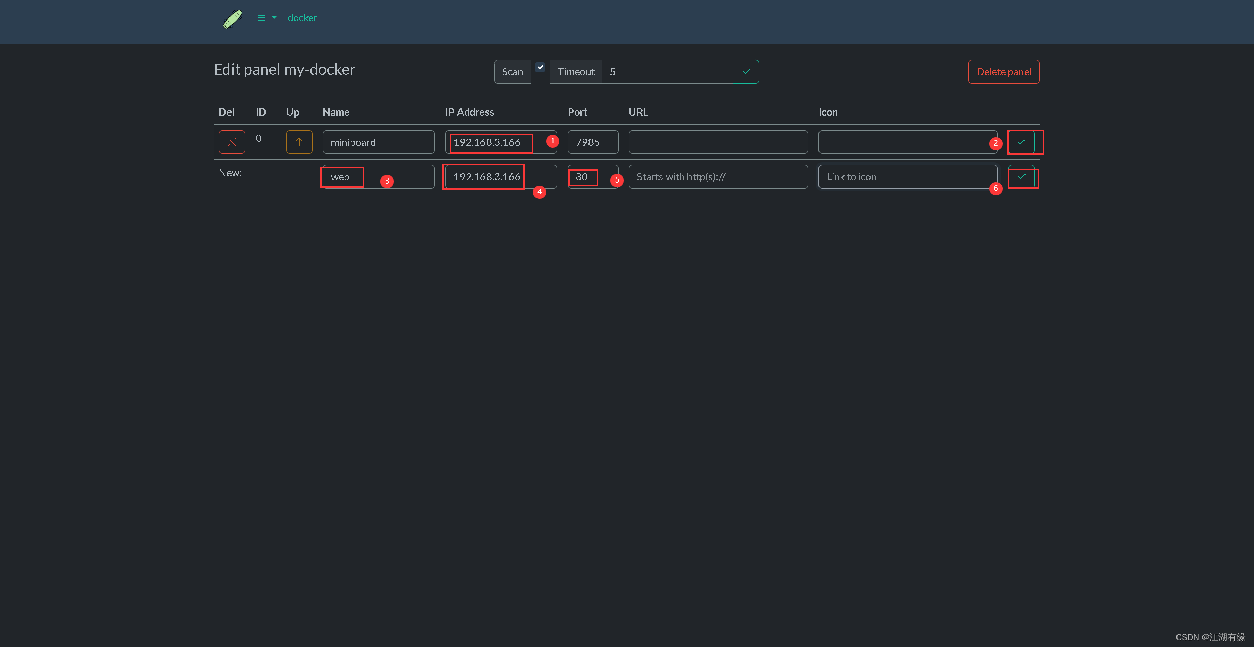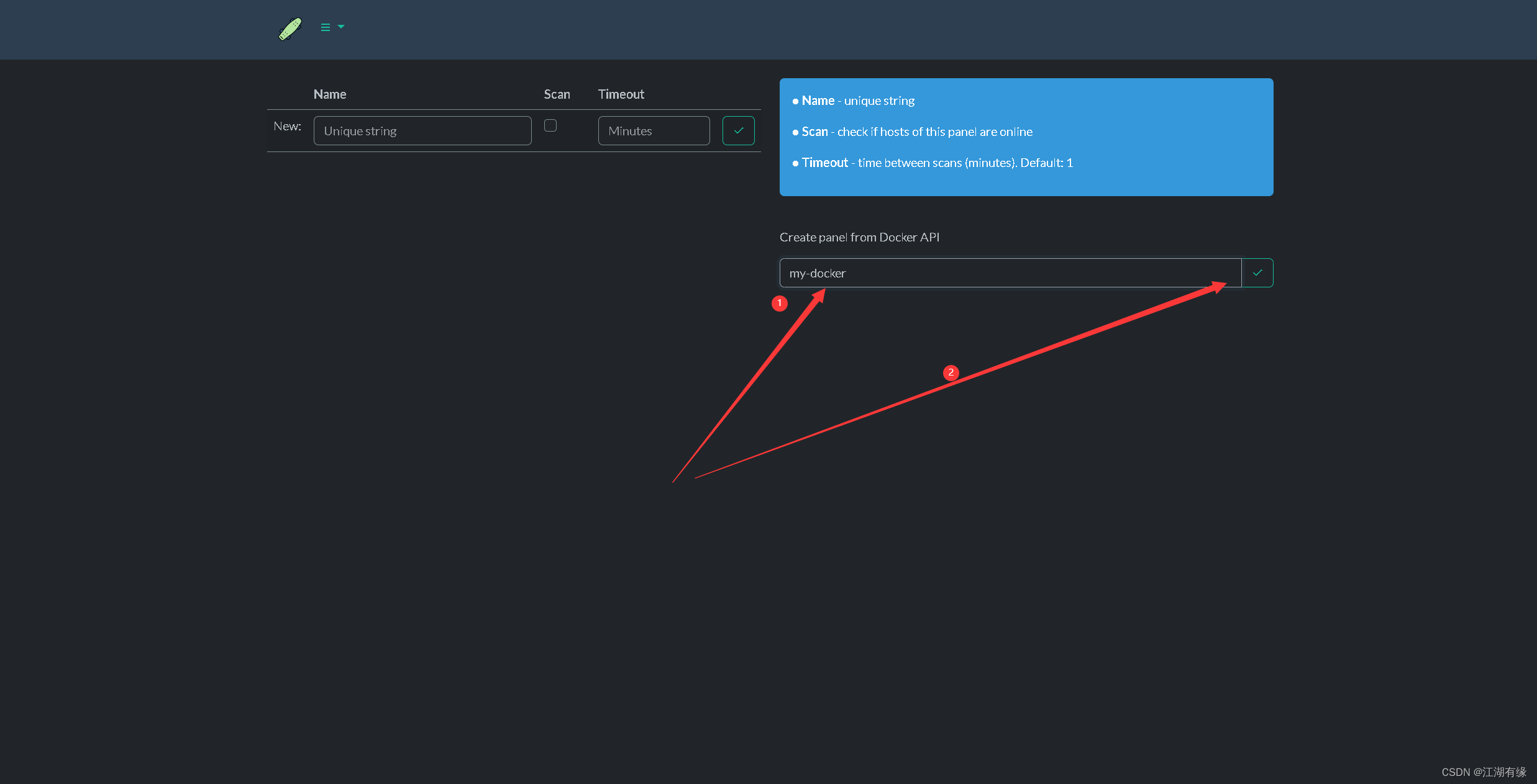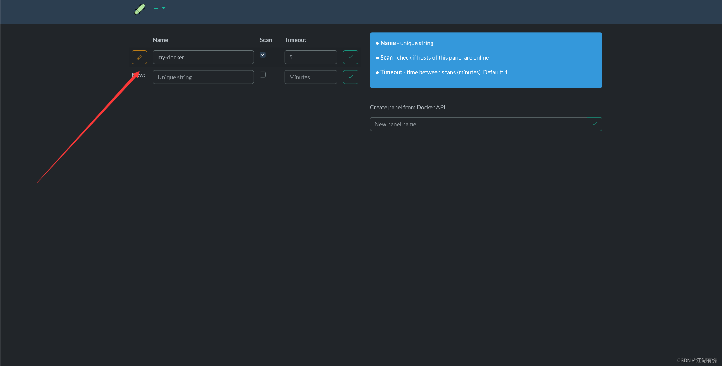 在下方的"Create panel from Docker API"选项中,设置仪表盘名称,选择确认。