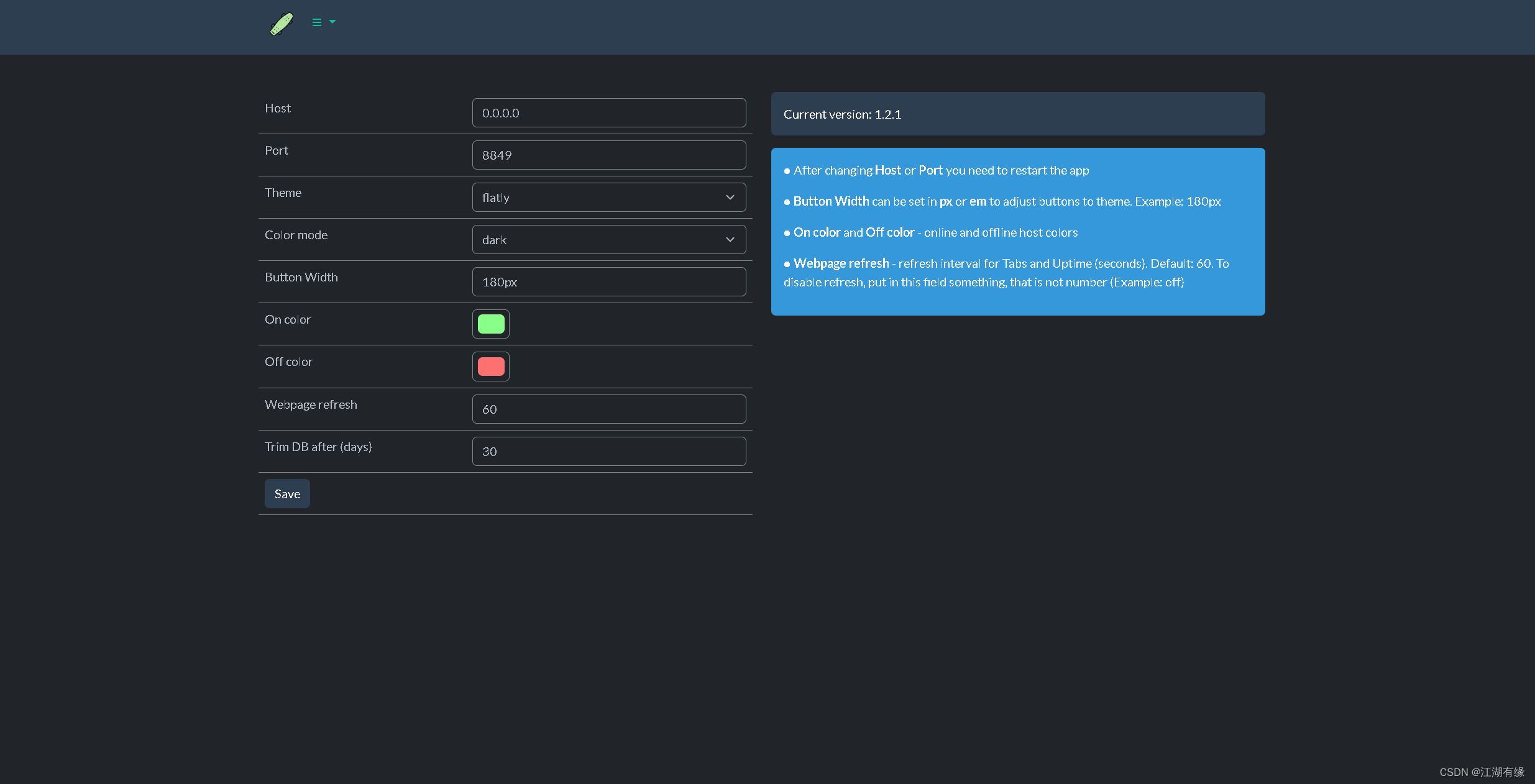 在菜单栏,选择"Config",进入系统设置页面,可以设置服务端口、主题等。